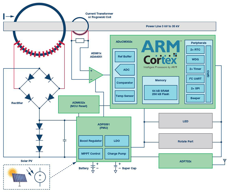 이러한 문제를 해결하기 위해 아나로그디바이스는 전력 수확 효율을 높이고 필요한 유지보수는 줄일 수 있도록 고장 표시기용 전선 감지기 아키텍처를 새롭게 개발했다(그림 3).
