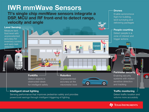 ▲ 그림 3. 산업용의 여러 시장에서 다양한 범위의 물체, 속도, 각도를 감지하는 TI의 IWR1x 단일칩 mmWave 센서 제품군