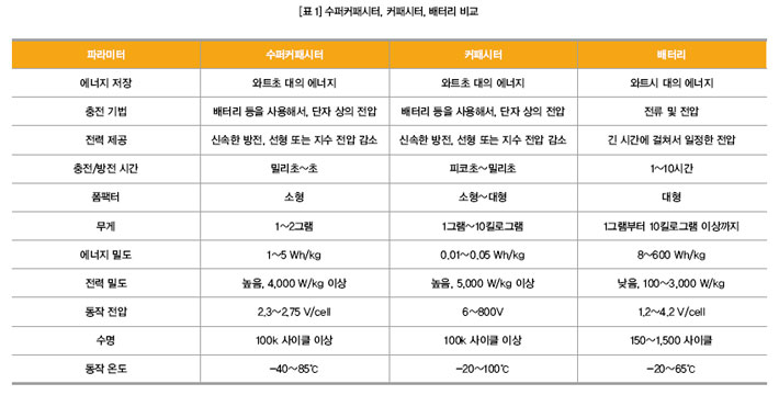 반면에 배터리는 많은 양의 에너지를 저장할 수 있으나 전력 밀도와 전력을 공급하는 면에서 제한적이다. 또한 배터리 내부에서 화학 반응이 일어나므로 사이클링과 관련해서 수명이 제한적이다. 그러므로 긴 시간에 걸쳐서 적은 양의 전력을 제공할 때 가장 효과적이다. 배터리로부터 짧은 순간에 높은 암페어를 인출하면 사용 가능한 작동 수명을 심각하게 떨어트린다. 〈표 1〉은 수퍼커패시터, 커패시터, 배터리의 장단점을 비교해서 보여준다.