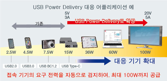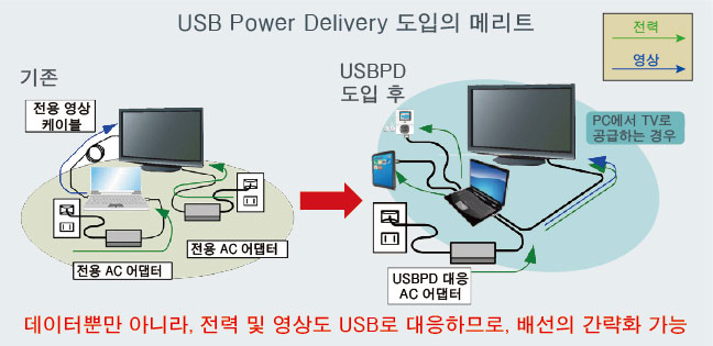 USBPD는 기존에는 15W까지의 전력만 공급할 수 있었던 USB Type-C 대응 기기 간에서 최대 100W(20V/5A)까지 전력 공급이 가능하다. 이에 따라, 노트북 및 TV 등 대전력이 필요한 기기도 USB 단자를 통한 전력 공급으로 구동이 가능하다. 가정이나 호텔 등에서 USB 콘센트의 보급이 진행되고 있어, USBPD는 인프라에도 변혁을 가져올 것으로 예상하고 있다.