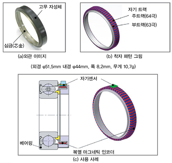 한편, NTN은 얇고 가벼워 로봇 관절 등에 부착이 가능한 정밀 각도 센서를 개발했다. 치밀하고 정밀한 위치 결정이 요구되는 로봇 시장에 대응하기 위해 NTN이 개발한 이 센서는 원형의 링 부분에 고무 자성체를 복합 성형한 후 극수가 다른 2열 자석 트랙을 고무 자성체에 적용한 복열 마그네틱 인코더와 자기 센서로 구성돼 있다. 기존의 인코더는 N극과 S극의 쌍 배열이 32/31이었으나, 이 센서는 64/63 극대에 배치되어 있어, 고정밀 각도 검출이 가능하다. 또한 인접한 자기 궤도에 영향을 주지 않도록 설계됐다.