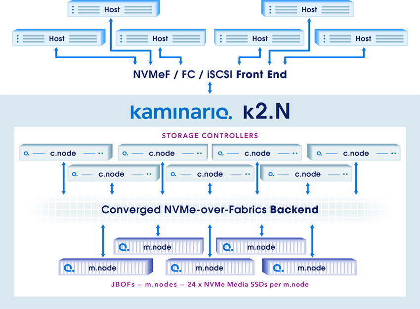 K2.N은 컨트롤러 노드(c.nodes)와 미디어 노드(m.nodes)로 구성되어 있으며, 공유 NVMeF, fabric 커넥티비티를 지원한다. 미디어 노드 개수에 상관없이, 2개 혹은 그 이상의 컨트롤러 노드를 구입하는 경우 데이터 절감 공간을 공유하여 진정한 의미의 액티브-액티브 구조의 스케일-아웃 스토리지 클러스터를 구성할 수 있다. K2.N은 특히 엔터프라이즈급 데이터 서비스를 제공하는 동시에 차별화 된 공유 스토리지 유연성을 보장하며, 다음과 같은 특장점을 제공한다.