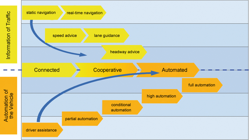 자율주행 자동차의 도입을 위한 발전 단계에 대해 다양한 예측이 있다. 비록 운전자가 완전히 자유로운 시스템(어떤 자동차에도 운전자가 없는 경우를 포함)은 먼 미래의 이야기이겠지만, 특정 작동 모드 및 영역에 국한된 운전자의 개입 없이 운행이 가능한 자동차는 조금 가까운 미래의 모습일 수 있다. 단적인 예로, 운전자를 보조하는 시스템과 자동 개입 시스템은 이미 도로 및 철도 차량에 적용되어 있다.
