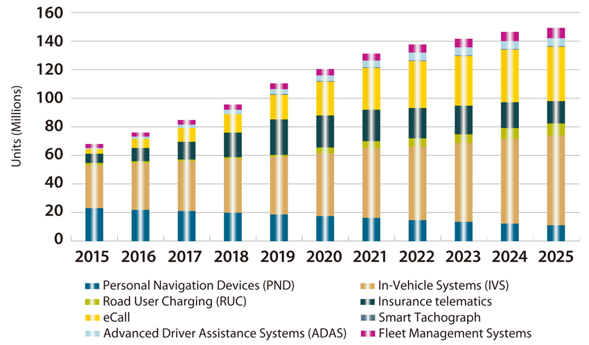 2008년 도로용 GNSS 출하 대수가 5,000만 대를 돌파 한 이후, 2016년에는 7,600만 대의 출하량을 기록했다. 같은 기간 동안 IVS 출하량은 2008년 120만 대에서 2016년 330만 대로 급증했다.