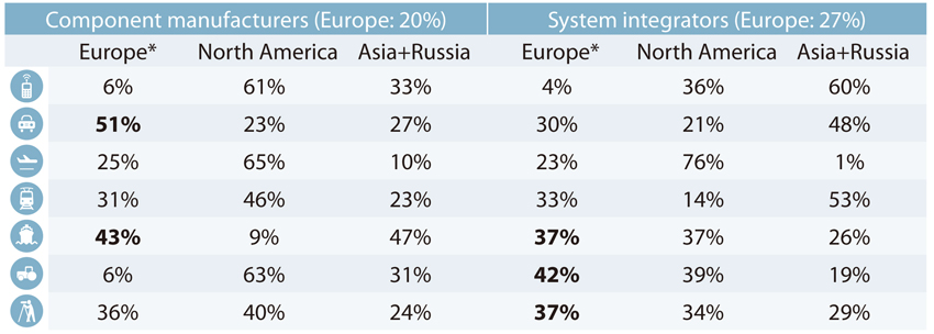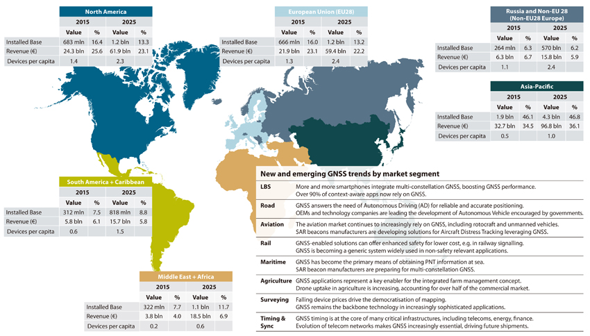 선도적인 부품 제조업체, 시스템 통합 업체, 부가가치 서비스 제공업체의 본사가 다수 위치한 미국(29%)은 전 세계 GNSS 시장을 지속적으로 선도하고 있다. 2015년 기준으로 유럽은 전 세계 매출의 25%를 차지하며 2위를 차지했고, 중국(11%)은 2012년 대비 4% 증가한 매출 점유율을 기록하며 4위를 기록하고 있다.