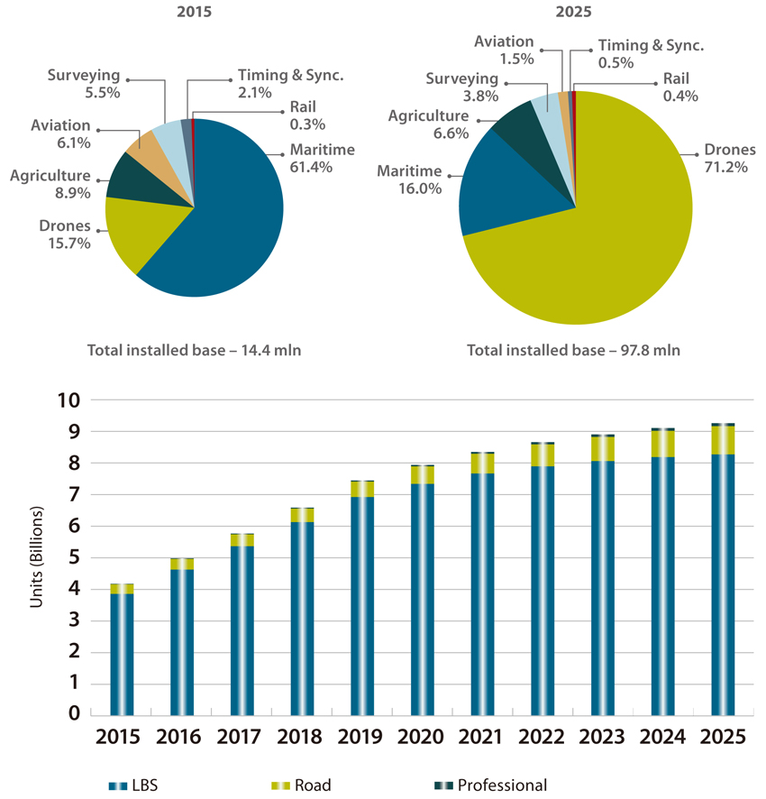 비록 전문 시장에서 사용되는 GNSS 기기의 수는 적지만, 지속가능하고 비용 효율적인 농업 생산에 사용되는 것, 교통 네트워크 조성 효과에 사용되는 것 또는 전기통신 네트워크에 동기화된 GNSS의 활용되는 것과는 관계없이 전 세계적으로 수십억 명의 사람들이 혜택을 볼 것이다. 성숙한 규제 환경에 의해 조성된 GNSS가 적용된 드론 시장은 급성장할 것으로 기대되고 있는데, 특히 2025년에 이르면 전문 분야의 GNSS 점유율이 70% 이상을 차지할 것으로 예상되고 있다.