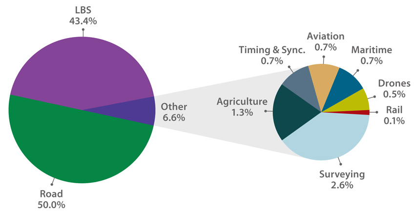 유닛 수에서 스마트폰에 비해 많은 차이를 보이는 도로 분야에서 사용되는 위치기반 서비스(LBS: Location based Service)의 유닛 수는 2017년에 3억 8,000만 개에 이를 것으로 보인다. 한편 IVS(In-Vehicle System) 시장의 성장과 eCall에 대한 EU 규제에 힘입어 도로 분야에 사용되는 GNSS를 탑재한 기기는 2017년부터 2020년까지 11.4%의 연평균 성장률을 보일 것으로 예상된다.