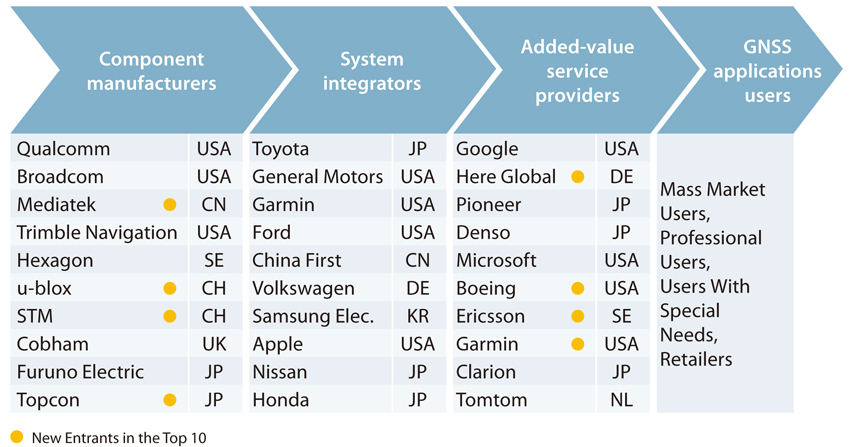 ?GNSS 산업은 다른 산업과 마찬가지로 몇몇 대기업과 많은 수의 중소기업으로 구성되어 있다. GNSS 산업에서 주요 기업들은 지속적으로 유망한 기업을 M&A하며 통합을 주도하고 있다.