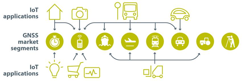 IoT에서는 위치 및 시간 정보를 얻기 위해 GNSS를 사용한다. 글로벌 IoT 시장의 미래 성장 잠재력에 대한 견해는 엄청나게 다르다. IoT를 좁고 보수적으로 정의하면, 전 세계 IoT 시장은 2020년에 1조 유로(약 1,337조 3,500억 원)의 수익을 창출할 것으로 전망된다. IoT를 포괄적으로 정의하면 2020년 전 세계 IoT 시장은 7조 유로(약 9,361조 4,500억 원)까지 예측해 볼 수 있다.