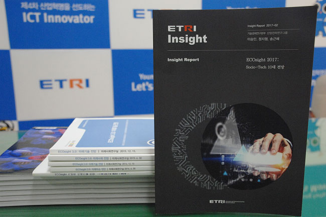 ETRI는 지난 2013년부터 에코사이트라는 이름으로 미래전망 관련 보고서를 발간해 오고 있다. 이번 보고서는‘에코사이트 2017’이란 이름으로 사회와 기술간 접점 이슈를 다루고 있다. Socio-Tech 10대 전망 보고서의 저자는 ETRI 기술경제연구본부의 이승민 책임연구원, 정지형 선임연구원, 송근혜 연구원이다.