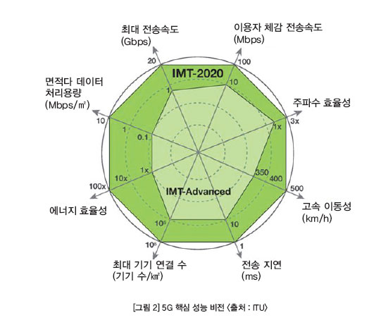 5G는 4G보다 20배 빠른 최대 20Gbps의 데이터 전송이 가능하고 1㎢에 약 100만 개의 기기들에게 사물인터넷 서비스가 제공돼 4G 10만개보다 10배 늘어났다. 실제 사용자가 체감할 수 있는 전송 속도도 기지국내 어디서든 100Mbps 이상의 빠른 속도로 데이터를 주고받을 수 있어 10Mbps에 머물렀던 4G보다 10배 빨라졌다.