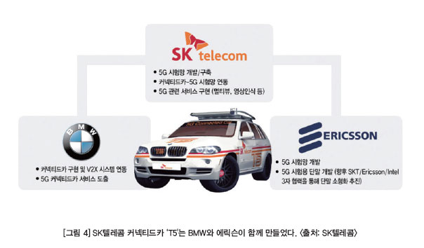 이런 SK텔레콤이 많은 신경을 쓰고 있는 분야는 바로 자동차로 자율주행, 커넥티드카와 같은 차세대 기술에 특히 매진하고 있다. 지난해 11월에는 세계 최초 5G 기반 커넥티드카 ‘T5'를 공개했고, 인천 영종도 BMW 드라이빙센터에 세계 최대 규모의 5G 시범망도 구축했다. 이를 통해 시속 170km에서 3.6Gbps로 통신하는데 성공하기도 했다.
