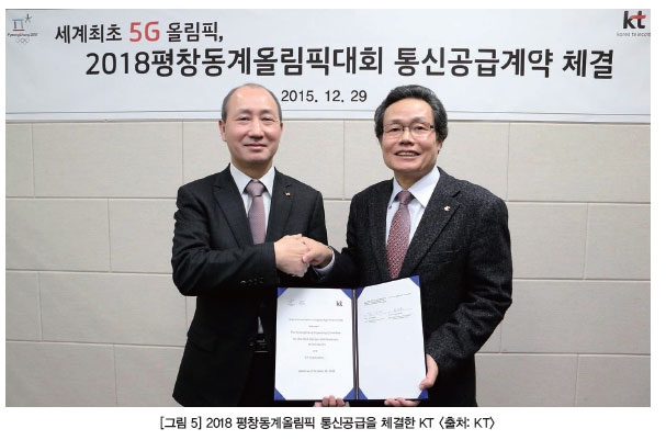 SK텔레콤이 5G를 위해 ‘자동차’에 큰 비중을 뒀다면, KT는 ‘올림픽’에 무게를 두고 움직였다. 2018년에 열리는 평창 동계올림픽의 통신 부분 공식 파트너사로 선정됐고, 올림픽 기간 중 시범서비스를 실시해 올림픽 자체를 KT 5G 기술을 알리는 기회로 삼겠다는 것이다. 이는 세계인의 관심이 몰리는 올림픽을 통해 확실한 홍보 효과를 얻고, 이후 진행될 5G 표준 규격 심사에도 KT에 유리하도록 만들겠다는 전략이 숨어있다.