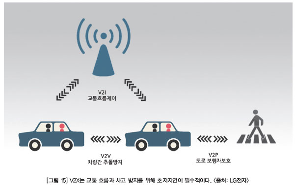 차량 통신인 V2X 역시 5G의 특성인 초저지연이 중요한 기술이다. 사람의 의지와 상관없이 움직이는 자율주행차, 커넥티드카의 등장은 교통 체계의 혁신을 가져올 것이다. 자율주행차에 설치된 센서는 차선, 앞 뒷차와의 간격을 파악하고 수천대 이상의 다른 자동차와 도로, 교량, 신호체계 등 인프라, 보행자들과의 지연이 거의 없는 실시간 통신을 통해 안정성과 주행 능력을 확보한다.