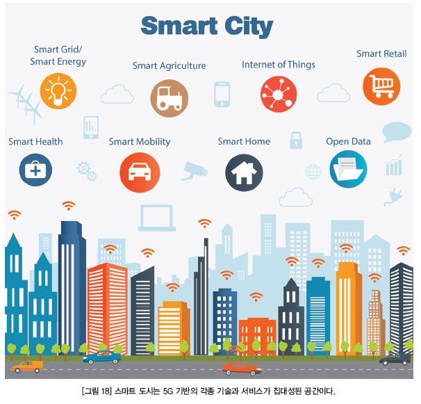스마트 도시는 앞서 언급되었던 스마트 홈, 스마트 오피스, 스마트 빌딩, 스마트 공장, 커넥티드카, 자율주행차 등 5G와 연결된 다양한 기술과 기기들이 하나로 집대성되어 인간의 신경망처럼 연결된 공간이다. 도로, 항만, 전기 등 도시 인프라를 효과적으로 관리하고 도시 문제를 해결함으로써 각종 비용을 절감하고 도시 생산성을 향상을 기대할 수 있다. 이런 스마트 도시는 현재 소수만 추진하고 있는데 5G 인프라가 충분히 구축된 위에 만들어져야 한다는 점에서 보편화되기까지는 시간이 필요할 전망이다.