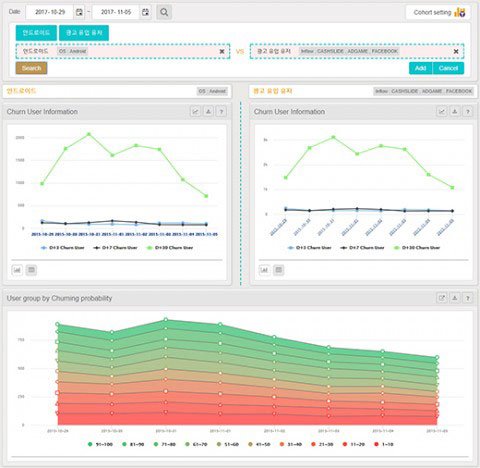 ‘Think Core’는 게임 내 모든 콘텐츠를 기반으로 한 빅데이터의 머신러닝 기법을 활용하여 높은 정확도의 사용자 이탈 예측 기능을 제공한다.
