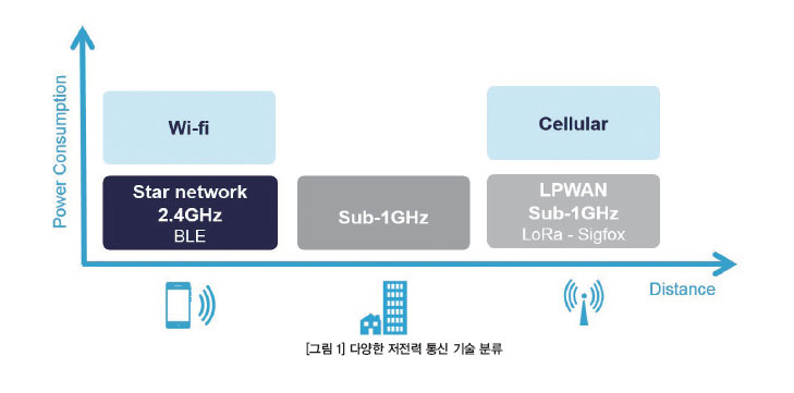 (그림 1)은 다양한 기술을 거리와 전력 소모에 따라 분류하고 있다. 저전력 기술들인 BLE, RF 서브 1GHz, 시그폭스에 대해서 자세히 살펴보자.