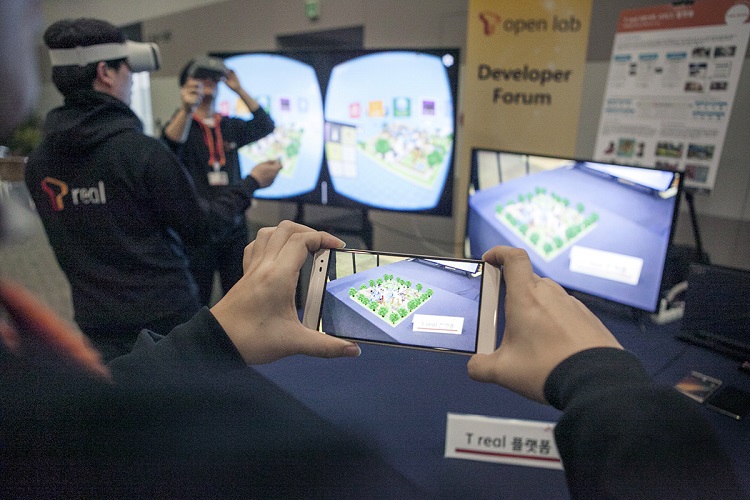 SK텔레콤 연구원들이 'T 리얼 플랫폼'을 시연하고 있다.