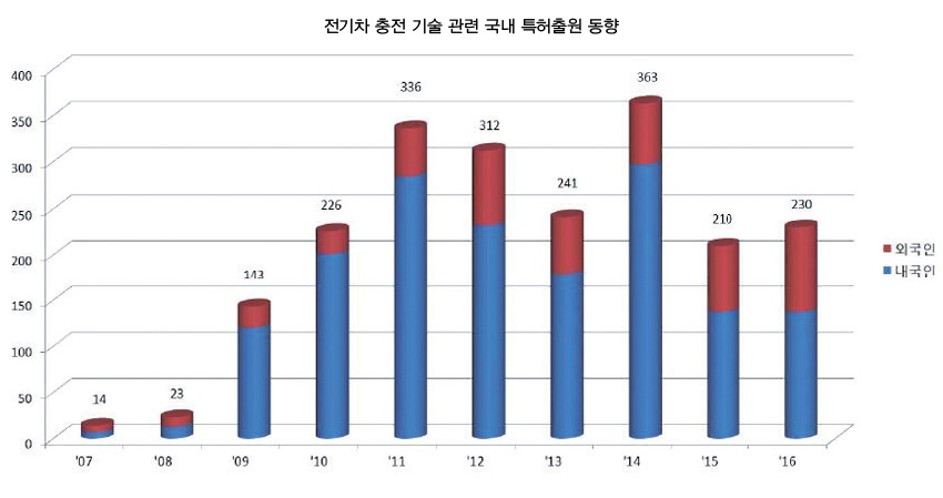 특허청(청장 성윤모)에 따르면, 전기차 기술에 관한 국내 특허출원(배터리 등 전기차 부품 자체 기술 제외)이 2007~2011년 202건에서 1,002건으로 연평균 49.2%의 높은 증가 추세를 보였다. 2012~13년에는 세계 경기 침체 영향으로 다소 주춤했으나, 2014~16년에는 879건에서 1,271건으로 다시 연평균 20.9%의 꾸준한 증가 추세를 보였다. 전기차 시장의 성장과 맞물려 국내 특허출원도 함께 증가한 것이다.