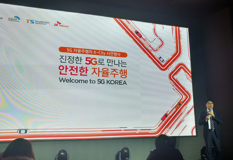 2대의 자율주행차에는 방송인 김진표 씨, SKT?서울대 연구원이 각각 좌석에 앉아 실시간으로 자율주행 상황을 설명했다. 시연에서는 선두 자율주행차가 교통사고, 공사 구간을 발견하자 뒤따르던 후발 자율주행차는 스스로 속도를 줄이고 안전한 차선으로 변경해 주행했다. 이어 스쿨존에서 갑자기 무단횡단하는 어린이 모형이 등장했고, CCTV를 통해 인지된 정보가 5G망 통해 자율주행차에 지연 없이 전달돼 급정거로 사고를 피했다. 무신호 교차로에서는 두 차량이 5G로 상호간, 관제센터와 교신하며 통행 우선순위를 스스로 정하기도 했다.