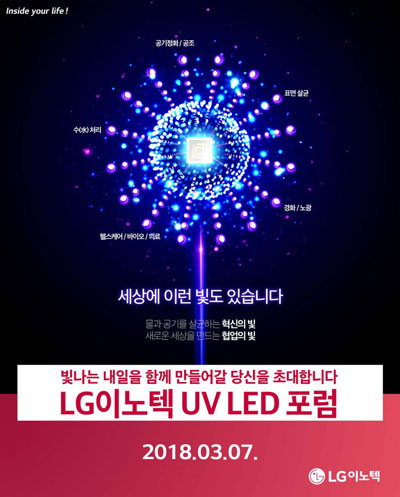 LG이노텍은 오는 3월 7일 서울시 강서구 마곡중앙10로 LG사이언스파크 통합지원센터에서 ‘UV LED 포럼’을 개최한다고 밝혔다. 국내 첫 UV LED 전문 행사로 최신 기술 및 제품을 이해하고 응용 분야까지 살펴볼 수 있는 자리다.