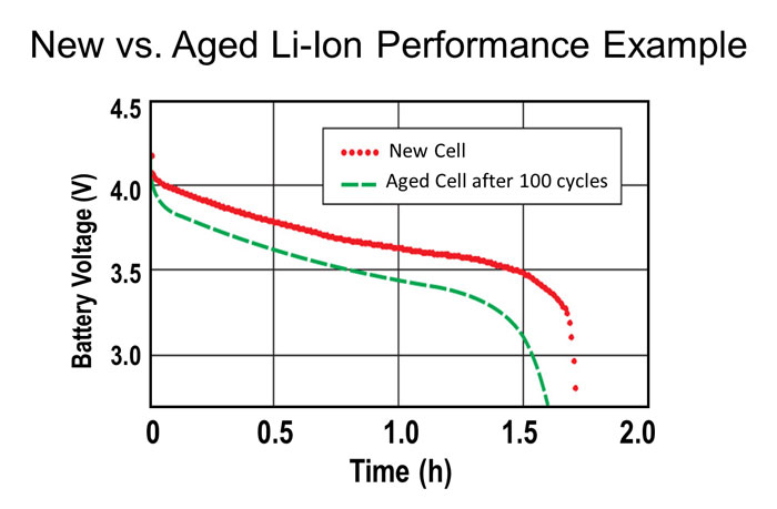 예를 들어서 최저 3.4V의 배터리 전압으로 동작 할 수 있는 시스템이라고 하자. 이러한 조건이라고 할 때 노후화된 배터리는 약 한 시간 동안밖에 에너지를 제공하지 못한다. 반면에 새 배터리는 약 1.7시간 동안 지속될 수 있다.