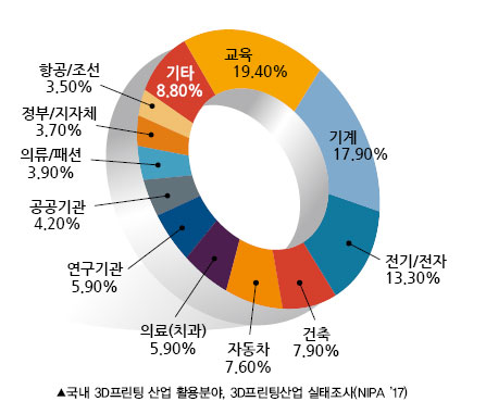 산업별로는 주로 교육(19.4%), 기계(17.9%), 전기/전자(13.3%), 건축(7.9%), 자동차(7.6%), 의료/치과(5.9%) 분야이다. 사용 용도는 시제품 제작, 전시모델/디자인 검증, 교육/연구 순으로 나타났다.