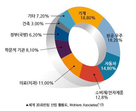 이처럼 장점이 많은 3D프린팅의 특징 때문에 현재 선진국에서는 다양한 산업분야에 적용하고 있다. 백분율로 나타냈을 때, 산업 분야별로 기계(19.9), 항공 우주(16.6), 자동차(13.8), 소비재/전자제품(13.1), 의료/치과(12.2), 학문적 기관(10.5), 정부/국방(5.9), 건축(3.1), 기타(4.9) 등으로 나눌 수 있다.