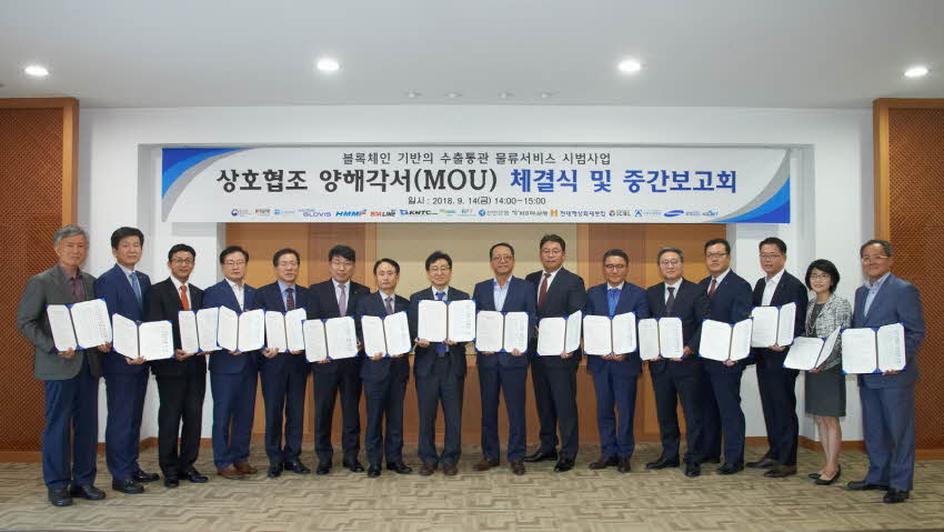관세청은 14일 서울본부세관에서 수출입 유관 공공기관, 선사, 보험사 등 48개 기관·기업과 블록체인 기반의 수출통관 물류서비스 사업추진을 위한 협약을 체결했다.