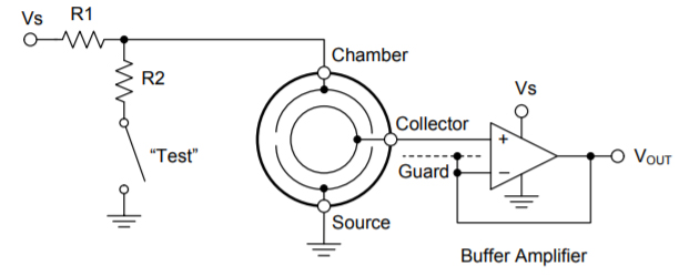 이 전압 강하는 VOUT으로 버퍼링되고, 감지기는 이러한 버퍼링을 챔버에 유입되는 연기를 나타내는 표시로 모니터링한다. VOUT은 비교기나 아날로그-디지털 컨버터(ADC)에 제공될 수 있다.