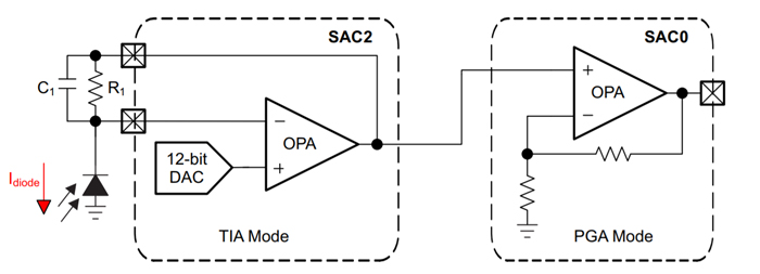 광전식 연기 감지기를 설계한다면 2개의 스마트 아날로그 콤보 모듈을 그림 3과 같이 1차 스테이지를 트랜스 임피던스 증폭기(TIA 모드)로, 2차 스테이지를 게인 스테이지(PGA 모드)로 구성할 수 있다. 스마트 아날로그 콤보는 피코 암페어 수준의 낮은 누설 입력을 지원하므로 전류 측정의 정확도를 향상시켜 연기 감지기 설계에 유용하다.