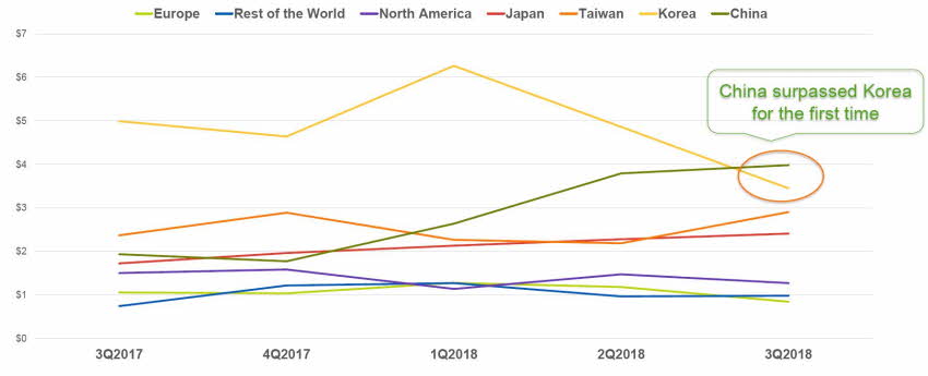 장비 분야에서는 2018년 3/4분기에 중국이 한국을 처음으로 넘어섰다. 2020년, 2021년에 대한 수치는 아직 조금 더 지켜봐야 하는 부분이라고 Clark는 전했다.