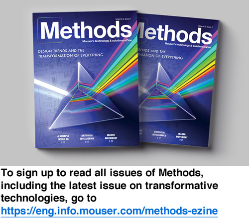 Mouser Electronics, Inc., the New Product Introduction (NPI) leader empowering innovation, announces the newest issue of its Methods technology and solutions eZine. The first issue of volume three, Design Trends and the Transformation of Everything, looks at transformative technologies such as 5G, augmented reality (AR), autonomous vehicles, and more, with articles penned by thought leaders and subject-matter experts.