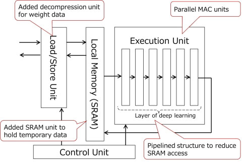 기존의 딥러닝은 각각의 DNN 레이어를 처리한 후 SRAM에 접속해야 한다. 전력 소모를 키우는 요인이다. 도시바의 딥러닝 가속기는 DNN의 DNN 처리 장치에 파이프라인(pipelined) 레이어 구조를 구축했다. 따라서 한 번의 SRAM 접속으로 일련의 DNN 계산을 실행할 수 있다.