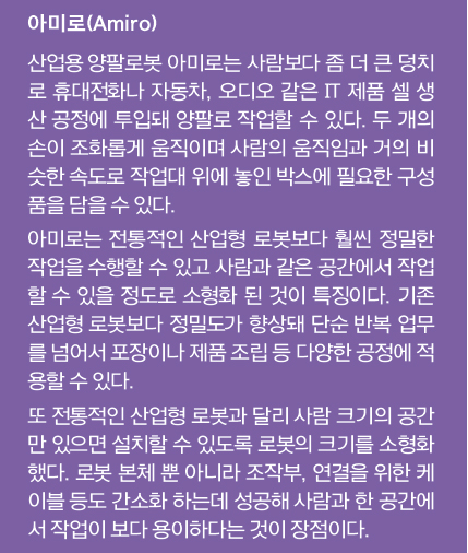 Q. 대표적인 연구 성과로 산업용 양팔로봇 ‘아미로’가 있는데요, 아미로는 어떤 로봇입니까?