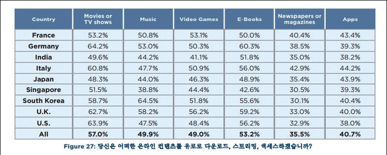 사용자의 58.7%는 영화 및 TV 프로그램에 유료로 액세스하고 있다. 국내 사용자의 44.8%는 영화, TV 프로그램 시청을 위해 DVD 대여, 구매나 온라인 스트리밍보다 다운로드를 선호하는 것으로 나타났다. 63.7%는 음악 청취를 위해 CD 구매나 다운로드보다 스트리밍을 선호하는 것으로 나타났다. 사용자의 단 3.2%만이 CD 구매를 선호했으며, 이는 이번 조사에서 가장 낮은 수치이다.