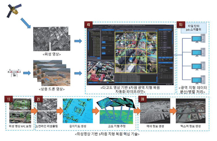 그러나 기존의 시스템들은 일부 범위를 미리 정의한 고도의 촬영 영상으로 한정해서 입력 받고, 특수한 위성 영상을 제대로 프로세싱하지 못하고 있다. 개발 기술은 이러한 문제를 해결하기 위해 다고도에서 촬영한 여러 가지 영상을 한 시스템에서 입력받아서 처리하고, 대규모 광역 지형 정보로 빠르고 정밀하게 복원 생성할 수 있도록 구성됐다.