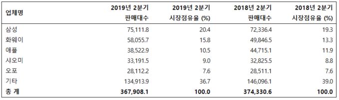 2019년 2분기 상위 5대 글로벌 스마트폰 업체 중 화웨이와 삼성은 각각 16.5%와 3.8%의 높은 연간 매출 증가율을 기록했다. 안슐 굽타 책임연구원은 "결과적으로 화웨이와 삼성의 2분기 시장 점유율이 상승했고, 이 두 업체의 판매량은 전세계 스마트폰 판매량의 3분의 1 이상을 차지하게 됐다"고 말했다.