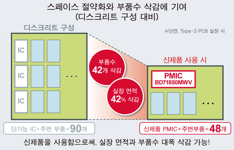 신제품과 동일한 전원 계통을 디스크리트 부품으로 구성한 경우에 비해 부품수를 42개, 실장 면적을 42% 삭감할 수 있다 (단면 실장, Type-3 PCB 실장 시). 또한, 양면 실장의 경우, 400mm2 이하의 적은 면적에서 전원 기능을 구성할 수 있다.
