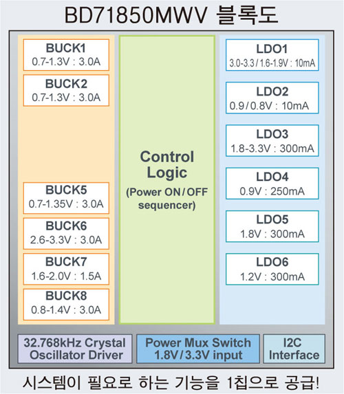 「BD71850MWV」는 i.MX 8M Nano 어플리케이션 프로세서의 전원 계통에 따라 전원 회로를 설계했다. 제어 로직, 강압 DC/DC 컨버터 (Buck Converter) 6ch, LDO 6ch을 집적하여, 프로세서뿐만 아니라 어플리케이션이 필요로 하는 DDR 메모리에도 1칩으로 전원을 공급할 수 있다. 또한, SDXC 카드 인터페이스용 1.8V / 3.3V 스위치, 32.768kHz 수정 진동자 버퍼, 다양한 보호 기능 (전원 계통별 출력 단락, 출력 과전압, 출력 과전류 및 서멀 셧다운)을 내장하고 있다.