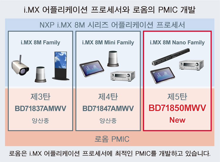 로옴은 NXP사의 i.MX 8M Family에 최적인 PMIC를 개발하고 있다. 2018년 「i.MX 8M Family」에 최적인 PMIC 「BD71837AMWV」, 2019년 「i.MX 8M Mini Family」에 최적인 PMIC 「BD71847AMWV」를 출시했다. 이번에는 최첨단 프로세스를 채용하여 저전력 성능을 구비한 「i.MX 8M Nano Family」에 최적인 PMIC 「BD71850MWV」를 새롭게 개발함으로써, i.MX 8M 시리즈의 모든 어플리케이션 프로세서의 파워 매니지먼트를 서포트한다.