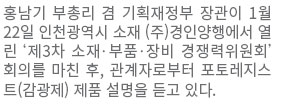 홍 부총리는 1월 22일 인천에 소재한 경인양행에서 ‘제3차 소재?부품?장비 경쟁력 위원회’를 주재하였다. 경인 양행은 염료, 포토레지스트용 재료를 생산하는 중견기업으로, 새로운 제조공법을 통한 반도체?OLED 관련 소개 개발 추진하고 있다. 경인양행은 기업간 협력을 통해 일본수출규제 3대 품목중 하나인 포토레지스트 관련 소재 개발을 추진 중이며, 새로운 제조공법으로 불화폴리이미드의 단량체(單量體)를 생산하고 있다. 단량체는 고분자화합물을 구성하는 단위가 되는 분자량이 작은 물질로 중합체를 합성할 때의 출발물질이다.