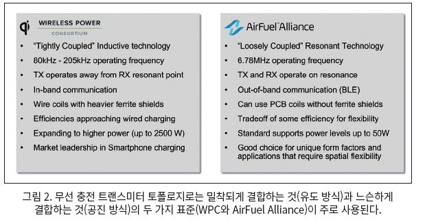 교류 자기장을 통해서 무선으로 전력을 전송하기 위해서 두 가지 기술이 주로 사용된다. 유도 방식과 공진 방식이다. 두 기술은 각기 특성이 다르고, 이를 반영해서 무선 충전 시장에서 두 표준 기관이 활동하고 있다. WPC(Wireless Power Consortium)와 AirFuel Alliance이다. 그림 2는 두 표준의 차이점을 요약하고 있다.