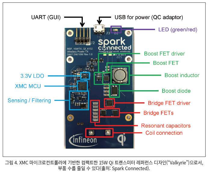 “Valkyrie”는 인증 받은 Qi 트랜스미터로서, 모든 급속 충전 스마트폰 용으로 최신의 15W 전력 전송 규격을 지원한다. 이 솔루션은 사용하기 편리한 무선 전원 설계 키트를 제공하며 향상된 FOD 기능과 함께 높은 효율(80% 이상의 테스트 결과)을 달성한다. 또한 이 솔루션은 필수 부품 수를 줄임으로써 시스템 비용을 줄일 수 있다(그림 4). 유선 충전에 필적하는 속도로 충전할 수 있으며, 동일한 하드웨어로 커스텀 충전 프로파일과 산업 표준을 모두 지원한다.