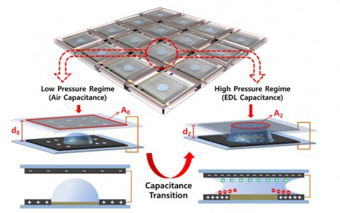 더 나아가 이 기술을 이용하여 소자와 소자 사이의 혼선(Crosstalk)이 완벽히 차단된 촉각센서 어레이를 제조하였다. 이와 같은 우수한 특성은 큰 유전율을 가지고 있는 이온성 액체가 상부 전극과 맞닿지 않을 때는 공기 정전용량을 지니다가 상부 전극에 닿는 순간 정전용량이 급격히 증가하는 현상을 이용한 것이다.