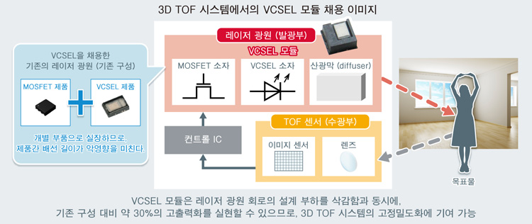 로옴(ROHM) 주식회사는 레이저 광원용 VCSEL의 고출력화를 통해, 공간 인식 • 거리 측정 시스템 (TOF 시스템)의 고정밀도화를 실현하는, VCSEL 모듈 기술을 확립했다.