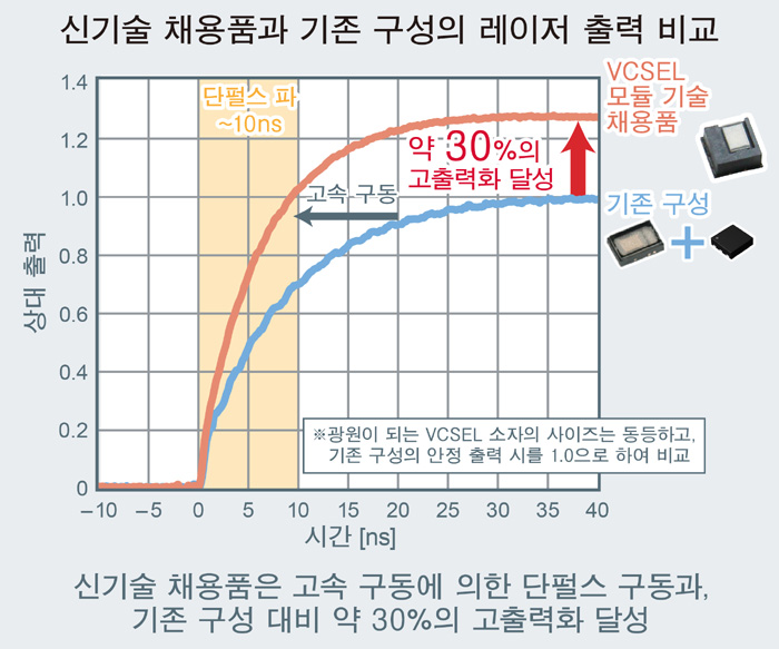 실제로 이 기술을 채용한 VCSEL 모듈은 레이저 광원 (VCSEL 모듈), TOF 센서 (이미지 센서 등의 수광 센서), 컨트롤 IC로 구성되는 공간 인식 • 거리 측정 시스템에서 평가하는 경우, TOF 센서에 대한 반사광의 양도 기존 구성 대비 약 30% 증가시킬 수 있으므로, TOF 시스템의 고정밀도화에 기여할 수 있다.