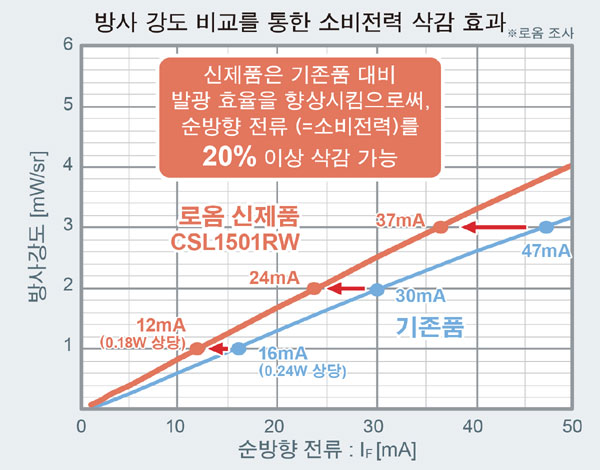 로옴의 강점인 소자 제조 공정부터 실시하는 개발 체제를 통해, 기존품 대비 방사 강도를 높여 발광 효율을 향상시킴으로써, 소비전력을 20% 이상 삭감 (방사 강도 1mW/sr 시, 0.24W에서 0.18W로 삭감)할 수 있다. 이러한 저전력화를 통해 어플리케이션의 장시간 구동에 기여한다.