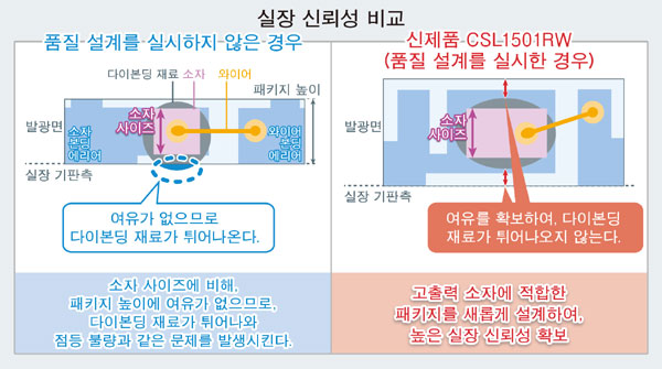 로옴의 철저한 품질 설계를 통해, 고출력 소자에 적합한 패키지를 새롭게 설계함으로써, 초소형 사이즈와 동시에 높은 실장 신뢰성을 확보했다. 초소형 제품의 경우, 기판 실장 시 소자 접착을 위한 다이본딩 재료가 튀어나와 점등 불량 등의 문제가 발생한다. 로옴의 신제품을 사용하면, 이러한 문제를 방지할 수 있다.