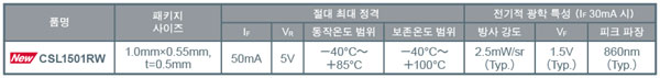 CSL1501RW는 적외 (피크 파장 860nm) LED로서, 초소형 사이즈 (업계 최소 수준 1.0mm×0.55mm, t=0.5mm)로 실장면에 대해 측면 발광이 가능하므로, 애플리케이션에 높은 디자인 자유도를 제공한다. 또한, 로옴의 강점인 소자 제조 공정부터 실시하는 개발 체제를 통해 발광 효율을 향상시킴으로써, 기존품 대비 소비전력을 20% 이상 삭감할 수 있으므로, 성능 향상이 요구되는 VR / MR / AR 어플리케이션의 시선 추적용 광원에 최적이다.